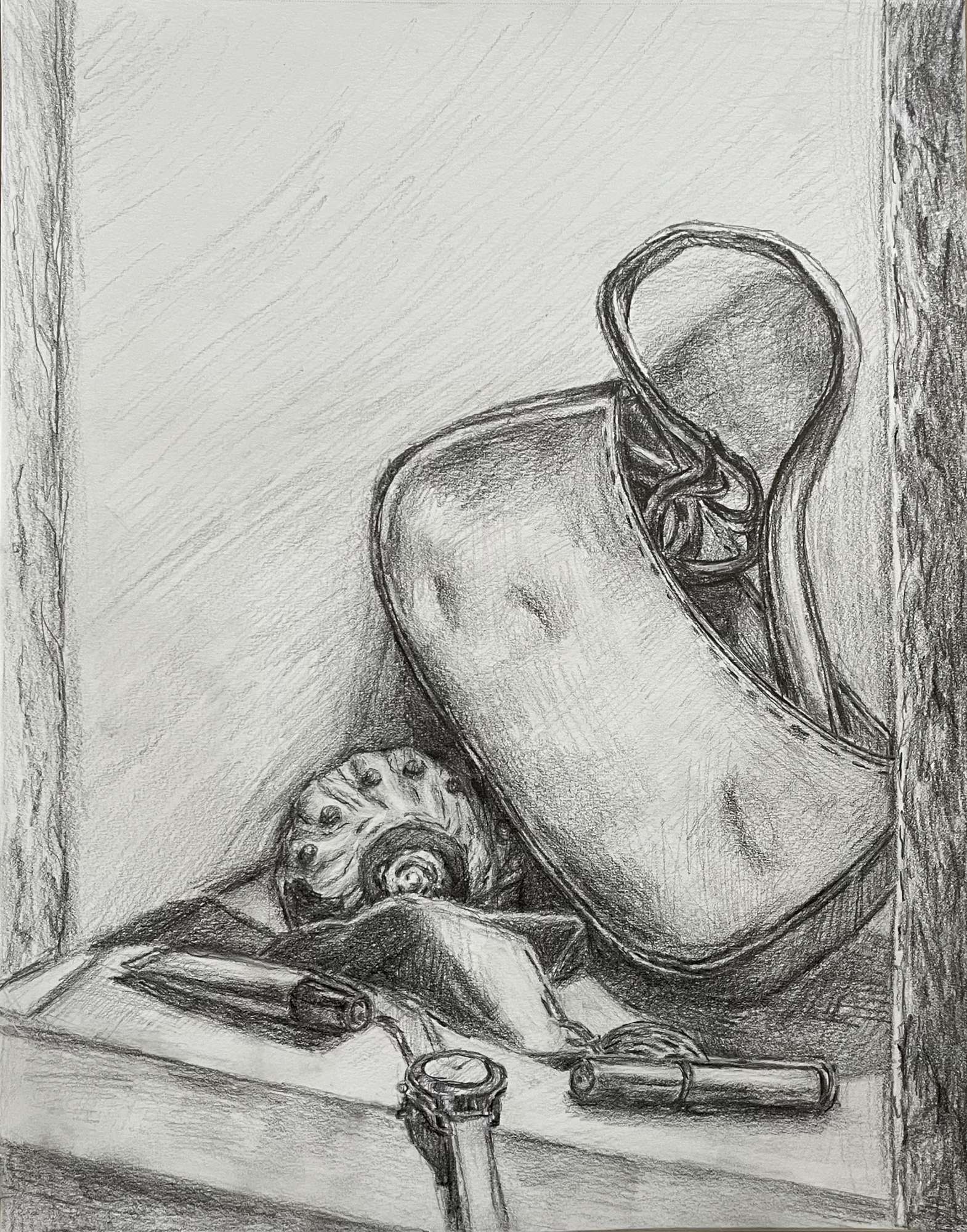 For this still life I dwelled on capturing my experiences through different objects prominent in my life. I painted a large sea shell during quarantine (desperate for entertainment) while the purse represents my social life, as I wore it out in Sophomore year. The medal showcases the achievements that I won during my History Day projects. When I was twelve I got the watch depicted in the drawing, and I wore it every day until I found it boring. The lipglosses connect to the era I’m in now, where I care more about my appearance. These objects come together in my still life, almost like a time capsule with the different memories of my life.